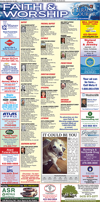 This page is from the Herald-Courier located in Bristol, VA and is owned by BH Media Group, Inc. It is an example of a very attractive format for both the churches and business sponsors.